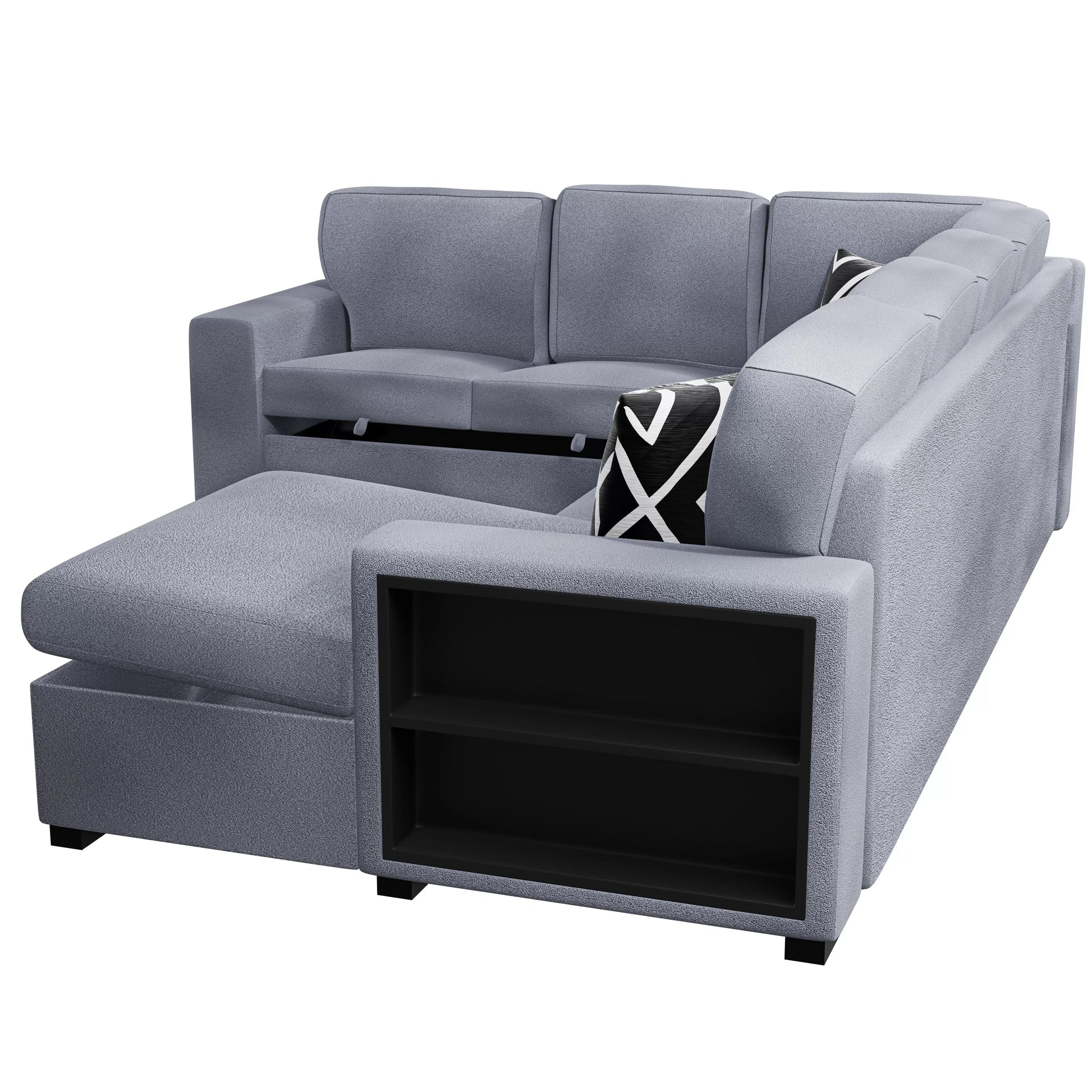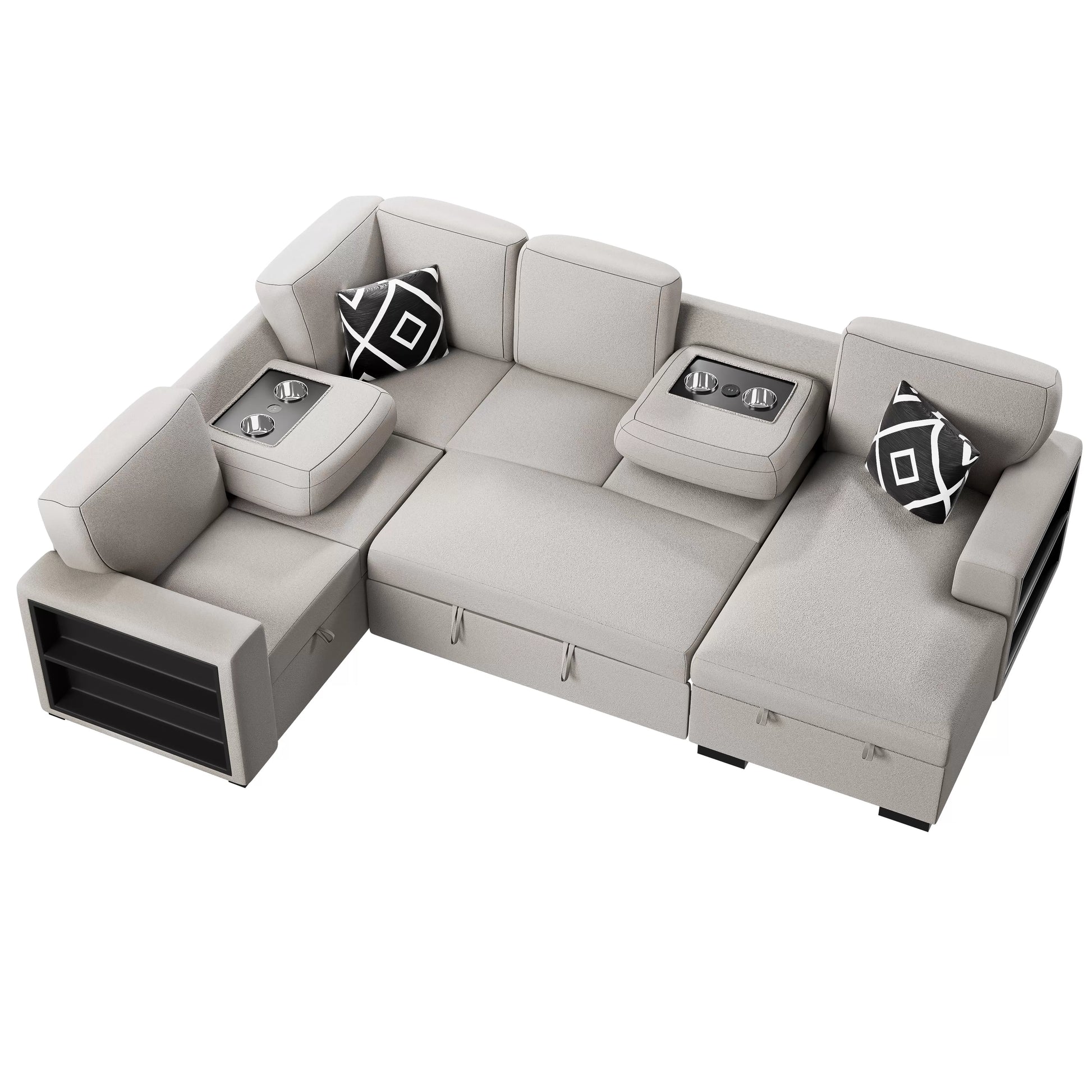 4-Pieces Reversible Convertible Sectional Sofa With 2 Accent Pillows, Built-In Shelves, Cup Holders, Fold-Down Table, Hidden Storage, Pull-Out Bed & Wireless Charging